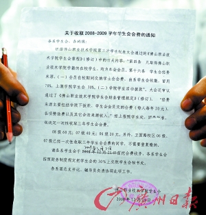 記者從該學(xué)校學(xué)生會2008年12月15日下發(fā)的一份蓋有公章的《關(guān)于收取2008~2009學(xué)年學(xué)生會會費(fèi)的通知》上看到,收取會費(fèi)的根據(jù)是佛山職業(yè)技術(shù)學(xué)院第三次學(xué)生代表大會通過的《佛山職業(yè)技術(shù)學(xué)院學(xué)生會章程》(修改)中的有關(guān)內(nèi)容,“凡取得佛山職業(yè)技術(shù)學(xué)院學(xué)籍的在校學(xué)生,均為本會會員”、“學(xué)生會經(jīng)費(fèi)來源,會員在校期間交納學(xué)生會會費(fèi)(每人每年20 元),由系學(xué)生會收繳,留用70%,上繳學(xué)院學(xué)生會30%。”