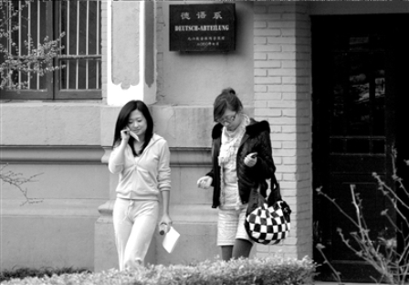 昨天下午4點46分,王亭亭站在北外的校門口,身邊跟隨著一位衣著時尚、戴著墨鏡的女士。幾個北外的學生當即認出了她,王亭亭身穿的粉色套裝和博客上的照片一模一樣,照片中染色的卷發已經拉直并且染成黑色,表情有些冷漠,并不顧及旁人的目光,低頭直接走進離北外校門不足200米的德語系辦公樓。