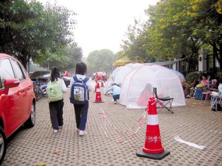 昨晚,記者來到祈福新村學校門口,昏黃的燈光下,疲憊不堪的家長們坐在躺椅上閑聊,有的干脆鉆到自帶的蒙古包帳篷里睡覺。現場到處彌漫蚊香和驅蚊水味道。