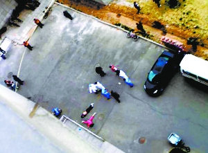 這兩名目擊者說,昨晚6時20分,一名女生從該樓13層東南側的樓梯窗口墜下,約5分鐘后男生從同樣的位置墜下。墜樓后,兩名學生橫躺在宿舍樓南側的地面上,女生穿粉紅色睡衣,男生光著上身,下身穿牛仔褲,身下有大片血跡。記者在47號公寓樓的 13層樓梯間看到,兩人墜樓的窗臺高約一米,窗戶的面積不足一平方米,窗戶的紗窗已被撕開,一件藍色的運動上衣還留在窗臺上,附近地面上還有數根煙頭。而該樓一層東側入口處的欄桿也被砸斷。