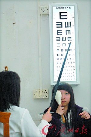 而記者了解到,江門中小學保健所近日所做的2008~2009學年中小學學生體質抽查結果顯示:學生視力下降很明顯,隨著年齡的增長,近視發生率越高,小學近視率是30%、初中是50%、高中是70%。