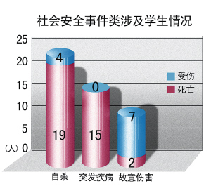 意外受傷(致死) 2008年高校發(fā)生2起大學生意外受傷事故,其中1起為學生參加空手道社團活動時,被對手踢中頭部,傷勢過重,不治身亡;另1起為學生做試驗過程中玻璃燒瓶發(fā)生爆裂,致使該學生手部受輕微傷。
