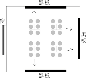 他們的教室不一般。課桌不再是傳統的“秧田式”,而是排成“工”字形擺放。一個“工”由6張課桌組成,一個教室大約有8組。“這樣就構成了擁擠卻不乏溫馨的小組型學習園地,很多課堂教學任務需要一個小組去完成,在這個過程中可以培養學生的合作能力、自主學習能力。”劉書記指指教室四周,原來白墻的地方都安置了黑板,也就是說,一個教室至少有三面黑板。“所有的黑板用膠帶紙分隔成40厘米左右寬度的小塊,供小組內學生板演、展示之用。數學習題、英文單詞、語文生字、古詩……內容隨課程的交替而常換常新。”