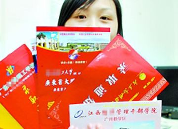 無獨有偶,在城區(qū)躍龍路44幢居住的梁靜波(化名),不久前竟然和50多歲的爸爸一起收到了來自江西某經(jīng)濟管理干部學院的“錄取通知書”。“錄取通知書”上的就讀條件非常誘人,不但可以自選專業(yè),還可實現(xiàn)專升本,而且百分百包分配,并保證學生在單位里能得到年終獎、出國深造、遷戶口、安排家屬就業(yè)等待遇。