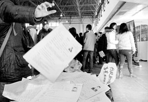 此次招聘會(huì)上,出現(xiàn)了個(gè)別公司將求職者的簡(jiǎn)歷亂扔的現(xiàn)象。招聘方對(duì)此的解釋是,扔掉的簡(jiǎn)歷都不符合公司招聘的要求。