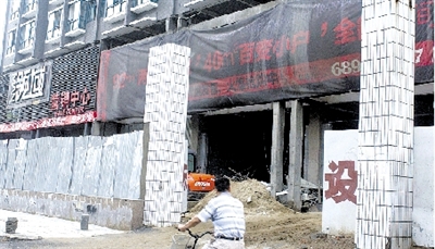 走進大樓內,施工聲不絕于耳,通道兩側堆滿建筑材料,墻體上的鋼架結構沒有拆除。