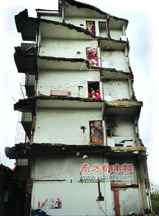 與租客不同,屋主比較擔心自身安全問題。“平時不起風還好,一起風我們就有些害怕!蔽葜鞣Q,他們一家三代6口人都住在這里,每次臺風來臨滿樓都是大風,有一次甚至嚇得兒媳婦跑到賓館開房睡覺。屋主稱,這棟房屋是自己與表弟在1993年修建的,占地面積約有160多平方米,兩家各占一半。幾年前寶地康泰房產公司改造紅山村,表弟與開發商達成協議后搬走,自家卻沒能與對方談妥。去年6月6日,開發商將屬于表弟的那一半拆除掉,才出現如此的“半邊樓”。