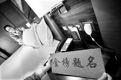 前天下午,記者在北京康源瑞廷酒店內(nèi)看到,工作人員將一張寫(xiě)有祝愿考生“金榜題名”字樣的卡片擺放在床鋪和床頭柜等明顯位置,使得房客一進(jìn)門(mén)就能看到。