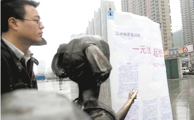 昨日10時,在金水路與未來路交叉口,一男子拿著一個上寫“因地暖質量問題,一元錢拍賣個人房產”字樣的牌子站在雨中,引來不少市民觀看。