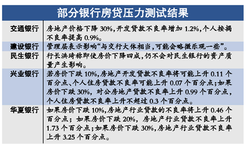 某家股份制銀行高層對(duì)記者表示,雖然在輕度和中度壓力環(huán)境下,銀行風(fēng)險(xiǎn)質(zhì)量得到了很好的控制,但是壓力測(cè)試結(jié)果顯示,在房?jī)r(jià)下調(diào)30%、基準(zhǔn)利率上浮108個(gè)基點(diǎn)的重度環(huán)境下,商業(yè)銀行的房地產(chǎn)貸款不良率會(huì)出現(xiàn)較大幅度躍升。