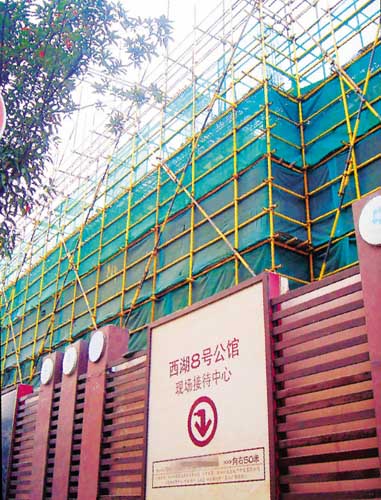 在吳山廣場邊上的四宜路上,記者找到了這個占地僅5980平方米的樓盤。因為臨近西湖,有限高規定,所以在一片二手房簇擁中的西湖8號公館并不是那么顯眼。整個樓盤僅有兩幢房子,而且中間還隔著一幢破舊的樓房,看起來,樓盤的小景觀并不是特別理想。