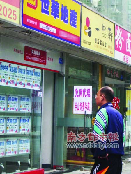 剛看到世華地產(chǎn)彩田村分行門口“免傭代理半山御景華庭”的告示時,記者還以為是二手樓,因為只有買二手房才需要付給中介公司傭金。采訪之后才知道,原來“免傭”的說法是相對中介公司而言的。“一般來說,在中介公司放盤的都是二手房,交易達(dá)成后中介向賣方雙方各自收取房款1.5%的傭金,而現(xiàn)在我們這里放盤的半山御景華庭是一手新樓,我們作為中介代理方帶客戶過去購買,對買家是不收取任何中介費用的,而是開發(fā)商給予我們傭金提成。”該店鋪經(jīng)紀(jì)人陸先生解釋道。