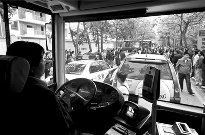 大批業主堵在北京石門東路上,現場交通堵塞,多輛公交車被堵住。 王磊攝