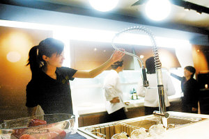 廚房里的布局是按照食品的貯存和準備、清洗和烹調這一操作過程安排的,應沿著三項主要設備即爐灶、冰箱和洗滌池組成一個三角形,安置最合宜的距離以省時省力。據專業人士介紹,這三邊之和應以0.45-0.67米為宜,過長和過小都會影響操作。在操作時,洗滌槽和爐灶間的往復最頻繁,因此廚房專家建議應把這一距離調整到1-2米之間較為合理,讓使用者在拿取與放置食品時不會太近或太遠,在轉身時也不會顯得局促。需要注意的是,放置冰箱的位置不宜靠近灶臺,因為后者經常會產生熱量,而且又是污染源,這將影響冰箱內的溫度。同時,冰箱也不宜太接近洗菜池,避免濺出的水導致冰箱漏電。