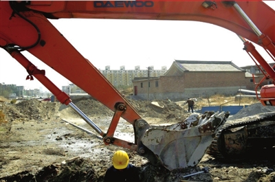 挖掘機在拆遷戶門前施工。記者朱嘉磊攝