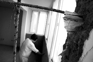 瑞旗家園兩業主裝修時,發現兩家陽臺之間的墻壁酥脆,碎墻塊用手一捏便成散沙狀(本報昨日報道)。昨日上午,昌平區建委兩名工作人員,與開發商工作人員到業主徐先生家中鑒定酥脆墻壁,建委人員對著陽臺墻壁踢了幾下,墻上的土便“嘩嘩”往下掉,該人員邊踢邊說,“這樣不行,不過關。”另一建委工作人員搖了搖露出的鋼筋,發現鋼筋與主體墻壁和天花板都沒勾連上,證實存在質量問題。