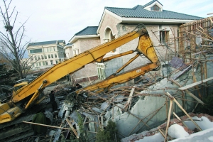 液壓剪拆除完地面部分后,液壓錘上場。長達1米的鋼鉆頭敲向地下室的天花板,散落的水泥塊和鋼筋掉到地下室內。這些水泥塊和鋼筋將直接用來回填地下室,以防止再次擴建。