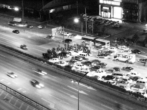 事發(fā)惠新東橋與望和橋之間的北四環(huán)外環(huán)主路。“四環(huán)上全是車,生生被一座人墻給截住了。”前晚10時許,芍藥居北里的雷先生在自家陽臺看到了這樣的場景。他介紹,當(dāng)時有數(shù)十人站在北四環(huán)53號小營路出口旁,將東向西主路的五條車道幾乎全部堵死。五分鐘內(nèi),上百輛經(jīng)過此地的轎車、機(jī)場巴士和商務(wù)客車被攔截在他們面前,喇叭聲和叫嚷聲不時響起。幾名司機(jī)下車?yán)碚摵螅巳鹤尦隽俗顑?nèi)側(cè)一條車道,車流緩慢通行。