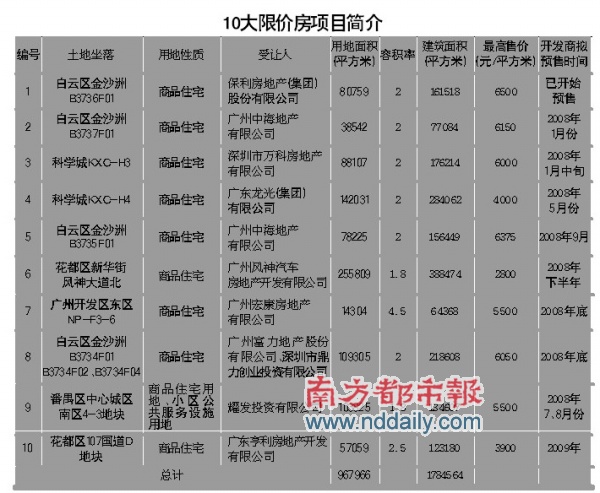廣州將在今明兩年向市場(chǎng)推出10個(gè)限價(jià)房項(xiàng)目,最高限價(jià)6500元/平方米,最低只有2800元/平方米。昨日,廣州市國土房管局公布了這10個(gè)限價(jià)房項(xiàng)目的詳細(xì)情況和預(yù)計(jì)銷售時(shí)間。業(yè)內(nèi)人士分析指出,今年限價(jià)房的供應(yīng)比例占到廣州商品房市場(chǎng)的20%,將會(huì)壓制限價(jià)房周邊地區(qū)的房價(jià)。