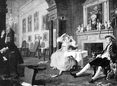 首先惹禍的是幾幅油畫作品。英國畫家威廉·霍加斯的著名作品《時髦的婚姻》在當(dāng)時被展出,這組畫共有6幅:訂婚、時髦婚姻、求醫(yī)、音樂會、決斗、自殺。正是這一組帶有強烈批判意義的畫引發(fā)了上流社會的不滿和爭議,紅衣大主教更是大發(fā)雷霆,下令禁士教士、學(xué)校校長和家長前去參觀,這件事在當(dāng)時也鬧得沸沸揚揚。
