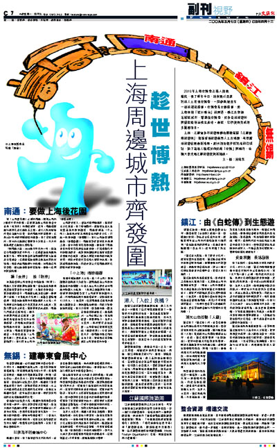 香港文匯報報道稱,世博會是全國盛事,而上海周邊“近水樓臺”的南通、鎮江及無錫等鄰近城市,都想借世博會,把各自的旅游和商貿經濟效益推至高峰。最近,它們便剛完成很多配套項目。