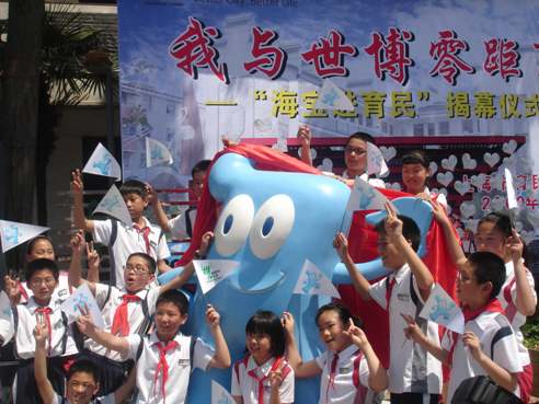 在“海寶”揭幕儀式上,學生代表表示,要努力學文化、學知識、學禮儀,從身邊的小事做起,積極行動,迎接世博、奉獻世博。