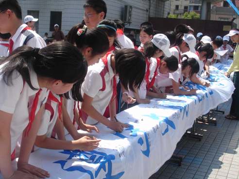 同學們在“世博文明公約”橫幅上簽名。