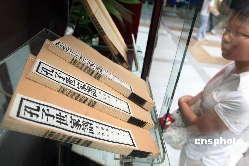 7月14日,在滬舉行的“尋根稽譜——上海圖書館藏家譜精品展”上,一部《孔子世家譜》吸引了眾多參觀者的目光。這部記載孔子后裔達七十余世的家譜,因其記錄的連續性和完整性,以及嚴謹的體例、翔實的資料,號稱“天下第一譜”。 據介紹,上海圖書館現藏有中國家譜近2萬種20萬冊,共計365個姓氏,是國內外收藏中國家譜原件最多的公藏機構。這次展出的60件展品,都是從館藏中挑選出來的精品。中新社發 湯彥俊 攝
