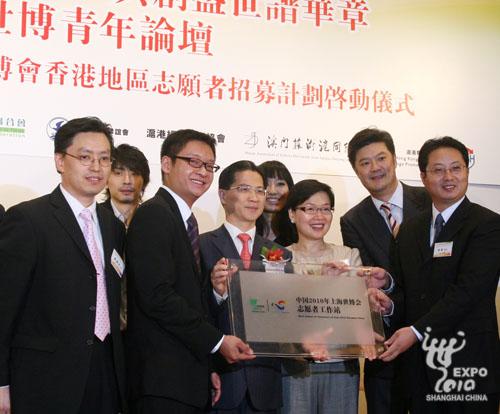 9月26日下午,“融入世博添精彩 共創(chuàng)盛世譜華章”世博青年論壇暨中國2010年上海世博會(huì)香港地區(qū)志愿者招募計(jì)劃啟動(dòng),共青團(tuán)上海市委書記、上海市世博會(huì)籌備工作領(lǐng)導(dǎo)小組志愿者組副組長潘敏向香港滬港青年交流促進(jìn)會(huì)頒發(fā)了“2010年上海世博會(huì)香港地區(qū)志愿者招募工作站”銘牌。