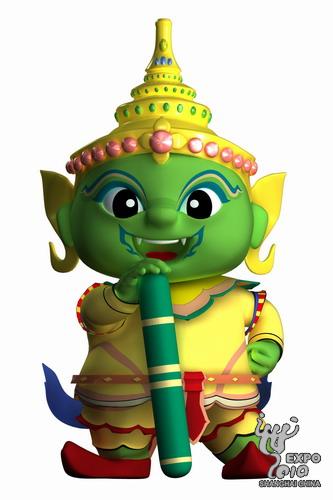 “小阿泰”名字來自泰語的“THAI”(自由和獨(dú)立),設(shè)計(jì)靈感來自守護(hù)在泰國(guó)寺廟門前的泰國(guó)守門神夜叉“INTARACHIT”塑像,這個(gè)可愛的小巨人以他彬彬有禮、充滿歡樂的微笑象征著泰國(guó)人的熱情好客。“小阿泰”的綠色皮膚代表富饒的泰國(guó)大地,橢圓形的大眼睛如同泰國(guó)人友好和善良的心靈窗口,自然純真的微笑充滿著溫馨和友善,手握的巨棒具有創(chuàng)造幸福、實(shí)現(xiàn)夢(mèng)想的神奇威力。
