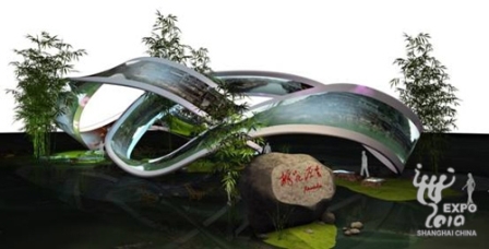 湖南館取名為“桃花源里·Xanadu”——Xanadu英文意為“世外桃源”,是西方世界描述神秘仙境時最廣泛使用的詞。湖南館的展示主題是“都市桃花源”。展館外觀之所以采用雙“魔比思環”相扣的造型,是取義無窮大符號“∞”和中國太極,這與和諧自然的中國理想城市意境以及長株潭城市群“兩型社會”的理念相契合!澳П人辑h”是雙環環繞,就單環而言展開長度達100米,高3米,只有一個面和一個邊界。由于主體造型是不規則的建筑環體,對施工和投影都帶來了重大挑戰。