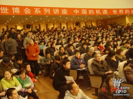 當(dāng)日下午1點,距離講座開始還有一個多小時,陜西省圖書館報告廳門前已經(jīng)排滿聽眾。報告廳講臺以上海世博會中國館為背景,會場內(nèi)張貼著上海世博會海報,講座之前播放了上海世博會的專題宣傳片。報告廳有300多個座位,工作人員臨時加了板凳,還有相當(dāng)多的聽眾站在走道上。下午2點30分,吳建中在熱烈的掌聲中走上講臺,以精彩、生動的語言,豐富、翔實的多媒體資料,介紹了上海世博會的理念與形態(tài),還就世博會的歷史、功能、意義,以及中國2010年上海世博會的主要內(nèi)容一一作了介紹;為聽眾詮釋了世博會的主題及其文化和理念,展示了世博會的風(fēng)貌和魅力。演講進入互動環(huán)節(jié),聽眾對如何參與上海世博會十分關(guān)心,吳建中耐心細致地與聽眾進行了交流。