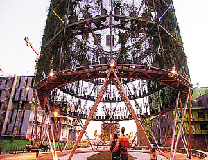 高大的“氣候樹”冠上覆蓋著巨大的銀色薄膜,因?yàn)橛羞@層太陽(yáng)能鍍膜,樹內(nèi)的能源自給率大大提高,光照下溫度也降下8-10攝氏度。“氣候樹”的名稱可謂名副其實(shí)。雖然造型不夠另類眩目,但實(shí)用、環(huán)保、節(jié)能的設(shè)計(jì)理念,以足以讓其成為新型城市公共建筑的典范。