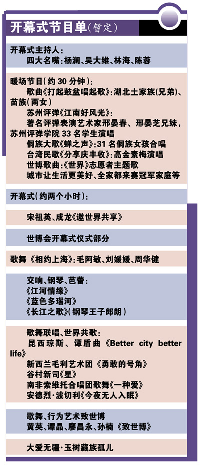 作為全世界人民的世博會,上海世博會開幕式將是中華風情和世界潮流的融合,“節(jié)目很精彩,大牌很多。”參加了世博開幕式彩排的邢女士告訴記者。正式演出時,首先登場的是宋祖英和成龍,一曲《邀世界共享》,向全世界人民發(fā)出邀請。在歌聲中,56個民族身穿華服,還夾雜著雜技、飛天、長城等中國專屬符號,非常具有民族特色。隨后出場的毛阿敏、周華健、劉媛媛,用一曲《相約上海》,代表了上海向世界發(fā)出世博的邀請。