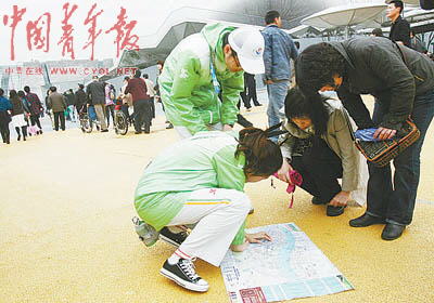中國(guó)館南廣場(chǎng)上的30名首批志愿者都是來自復(fù)旦大學(xué)的學(xué)生。他們的工作在很多人看來很簡(jiǎn)單,就是疏導(dǎo)游客,給游客指路。他們每天要重復(fù)幾萬次的回答就是:“對(duì)不起,預(yù)約券已經(jīng)發(fā)完了”,“您好,請(qǐng)往這邊走”……“現(xiàn)在我已經(jīng)不用看地圖就能清楚地給游客指路了。以前還不熟悉的時(shí)候,我利用休息的時(shí)間不斷地看地圖,已經(jīng)翻爛了兩份地圖,這是第三份了。”錢琲從包里翻開她的園區(qū)地圖,這一份也已經(jīng)快被她翻爛了,快斷裂的地方她用透明膠布粘著。