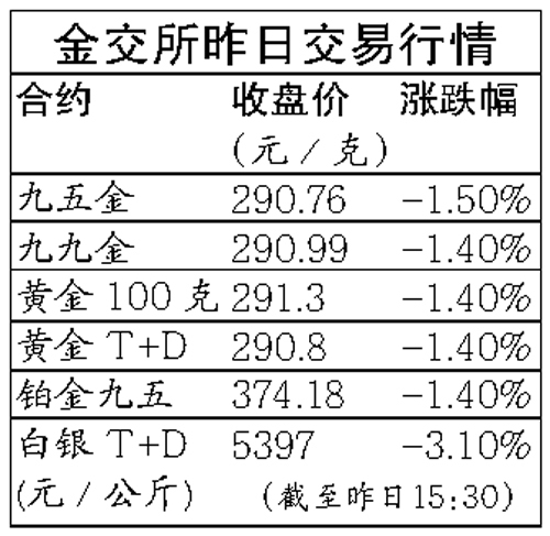 金價從上周五開始“四連跳”,受此影響,昨日國內金價也震蕩收低,跌幅達1.44%。