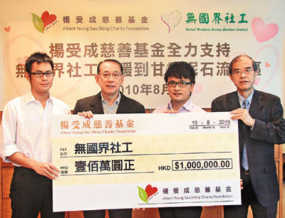 而任“無國界社工”永遠榮譽會長的英皇集團主席楊受成昨日以“楊受成慈善基金”名義捐出100萬港元予無國界社工,并安排該組織之支持團隊親赴災區協助賑災工作。“無國界社工”將派出5名義工于本周五或以前到災區視察災情,并安排該100萬元善款購買災民目前最需要的物資,例如一般生活必需品等。首批物資最快可于本月20日送到災民手中。中聯辦社會工作部副部長黃清芳出席支票交接儀式。