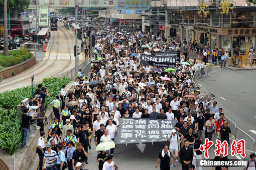 中新社香港8月29日電 (記者 曾嘉)香港29日下午舉行“沉痛哀悼遇難同胞、要求徹查事件真相”游行,游行以沉默及平和方式進行。主辦方表示,游行者達8萬人。特區行政長官曾蔭權表示,香港市民的理性游行加強了他處理菲律賓人質劫持事件善后工作的決心。