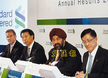 二月二十六日,渣打集團在香港舉行二零零七年度全年業(yè)績發(fā)布會。集團在二零零七年全年盈利錄得增長百分之二十五(25%),達二百一十九點四一億港元(219.41),其中經營收入八百六十三點二三億港元(863.23),增長百分之二十八(28%)。在香港業(yè)務方面,渣打香港除稅前營利九十三點零五億港元(93.05),上升百分之三十四(34%),經營收入有一百六十一點三億元(161.3),增長百分之二十八(28%)。圖為渣打集團高層出席業(yè)績發(fā)布會。 中新社發(fā) 鄧慶樂 攝