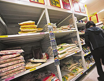 國際市場食用米供應(yīng)緊張和大幅加價,令香港部分市民出現(xiàn)恐慌心理,紛紛到超市入貨。3月31日,一些超市的貨架上,部分牌子的泰國米已經(jīng)缺貨。有市民表示,擔心米價會再上升,所以入多點貨,有市民甚至用小推車一次性購十幾包。不過,也有市民表示并不擔心,因為“一包米可以吃很久”。