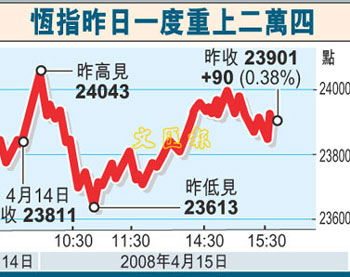 中新網4月16日電 據香港文匯報報道,大市缺乏方向,港股表現反復。15日大市高開139點后,一度重上24000點關口,但其后在高位沽壓顯著增加,恒指收市升90點至23901點,成交縮減至714.5億元。分析員指,大市仍未能突破250天線,料短期內大市仍在22000-25000點徘徊。