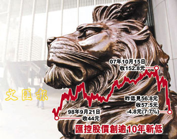 匯控20日在倫敦股市繼續(xù)下挫,中段股價跌逾4%至480便士,相等于51.94港元。于20日晚11時10分,匯控美國預(yù)托證券(ADR)折算每股報52.81港元,較香港收市再跌4.69港元,預(yù)示匯控21日仍會續(xù)跌。