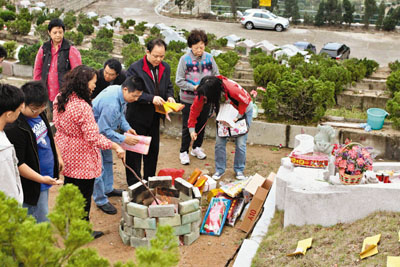 家族成員劉女士表示,祭品總值超過3000元,除部分洋酒、水果等食物會帶回家之外,其它諸如“金表”、“西服”等紙扎祭品都會在拜祭后燒給先人使用。她表示,潮汕人對傳統(tǒng)祭祀習俗非常重視,一年一次的拜祭先人一定是召集全家族齊出動。她又說:“年年祭祖,只有今年乳豬、燒雞、水果等祭品是雙份的,就連跪拜用的洋酒也帶了兩瓶。總之,大家的生活漸好,荷包也比往年漲一些,當然也希望祖先吃好過好。”家中最小成員趙同學說,自己專門準備了黃菊花和百合獻給外公,“我今年是第一次來祭掃,還真沒見過這么隆重的祭祀場面。”