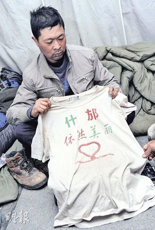 “眼看手勿動(dòng)!”記者欲一睹黃福榮日記,男子立即阻止:“不行,我要將黃大哥的日記,親手交給他的家人。”手持日記的叫李樹(shù)忠,是內(nèi)地一家社福機(jī)構(gòu)的救災(zāi)義工,與阿福結(jié)緣于汶川地震,“我不單有黃大哥的日記,還有他在災(zāi)區(qū)穿過(guò)的T恤”。