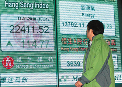中新網1月12日電 據香港《文匯報》報道,受融資融券及股指期貨落實的消息刺激,11日內地股市早盤急漲,也刺激港股最高曾升375點,但午后港股在內地股市升幅收窄的拖累下急回,收市僅升114.77點至22411.52點。