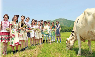 應屆港姐候選佳麗與嘉賓胡杏兒及陳倩揚,到高橋牧場喂飼乳牛。(圖片來源:文匯報)