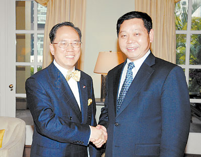 中新網12月18日電 應香港特區行政長官曾蔭權的邀請,深圳市委副書記、市長許宗衡17日率深圳市政府代表團訪問香港,為期3日。據香港文匯報報道,許宗衡抵港即在禮賓府拜會曾蔭權,他表示,深港兩地政府認識越來越一致,合作越來越緊密,溝通越來越密切,了解越來越深入,當前深港合作已經進入歷史上最好的時期之一。