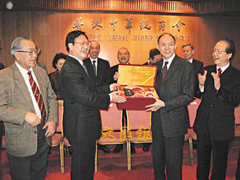 中總霍震寰會長以及林廣兆、張成雄、陳幼南、林銘森副會長及多位常董、會董與來賓座談,并設(shè)晚宴歡迎李春明副省長一行;粽疱緯L與林廣兆副會長均表示,中博會是信息交流的重要平臺,是世界了解中部地區(qū)發(fā)展的窗口,香港工商界都十分重視。中總長期以來與香港工商界以及世界華商保持緊密聯(lián)系,可以協(xié)助湖北省政府發(fā)布中博會信息。