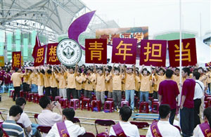 參加歌會的演員分別來自廣州地區(qū)各少年團(tuán)體、中高等院校、武警部隊、邊防部隊等,演員隊伍超過3000人。歌會以一組組由大學(xué)生和武警官兵組成的斑斕圖案,一首首青春勵志歌曲,從《我的中國心》、《大中國》到《我們年輕人》,讓在場青年不時歡呼喝彩。