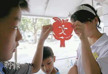 Dawn26日與4名同受艾滋病影響的內(nèi)地年輕人來香港訪問,先到香港單親協(xié)會(huì)探望10多名單親兒童,一齊透過剪紙表達(dá)愿望。Dawn用紅紙剪出蘋果,上面有個(gè)“文”字,她說,最希望母親可以讀書,“吃下充滿知識(shí)的蘋果,那就有希望了”。
